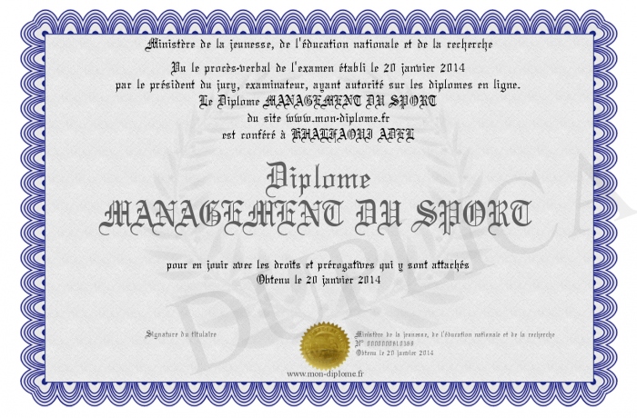 Envoyez par email votre Diplôme MANAGEMENT DU SPORT personalisé