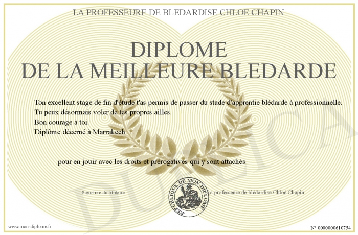 Envoyez par email votre Diplôme de la meilleure blédarde personalisé