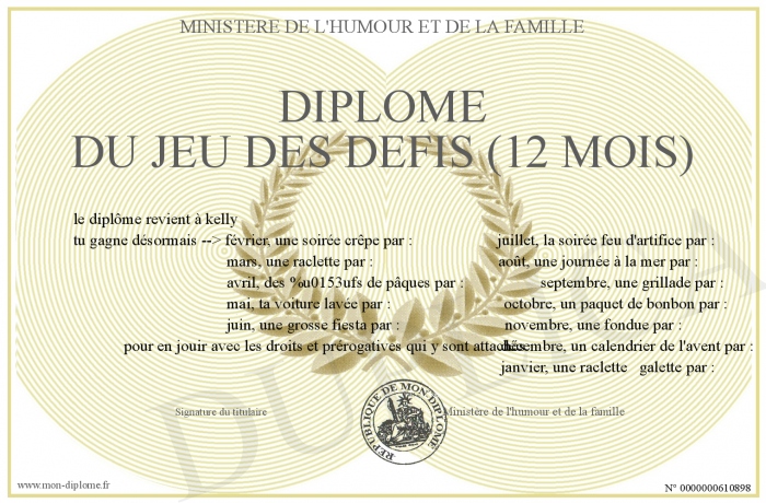 Envoyez par email votre Diplôme du jeu des défis (12 mois) personalisé