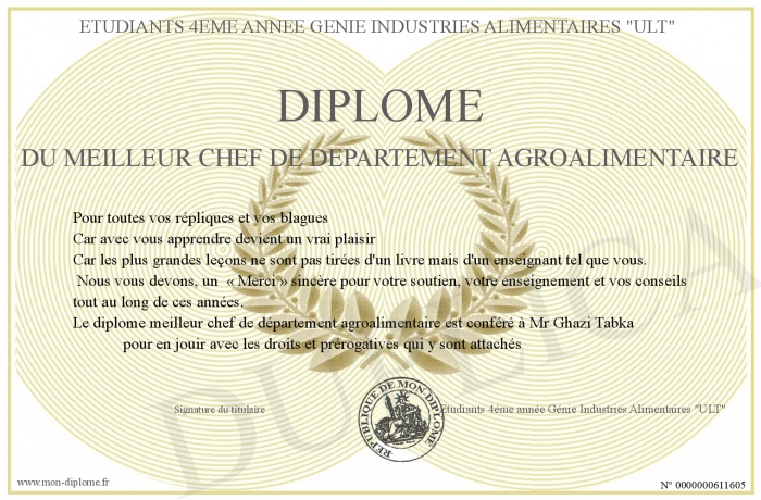 Envoyez par email votre Diplôme du Meilleur chef de département Agroalimentaire personalisé
