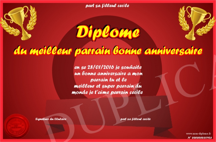 Envoyez par email votre Diplôme du meilleur parrain bonne anniversaire personalisé