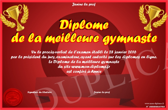Envoyez par email votre Diplome de la meilleure gymnaste personalisé