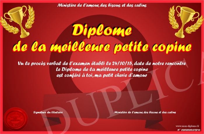 Envoyez par email votre Diplome de la meilleure petite copine personalisé