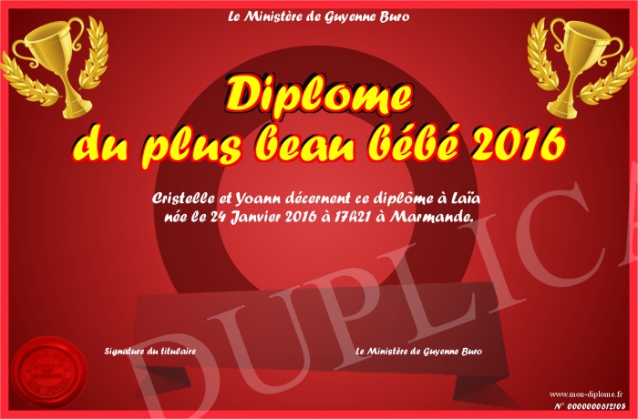 Envoyez par email votre Diplôme du plus beau bébé 2016 personalisé
