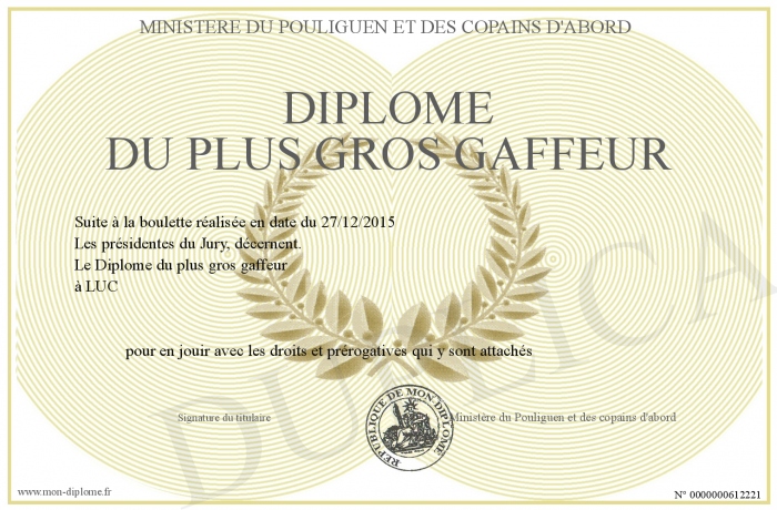 Envoyez par email votre Diplôme du plus gros gaffeur personalisé