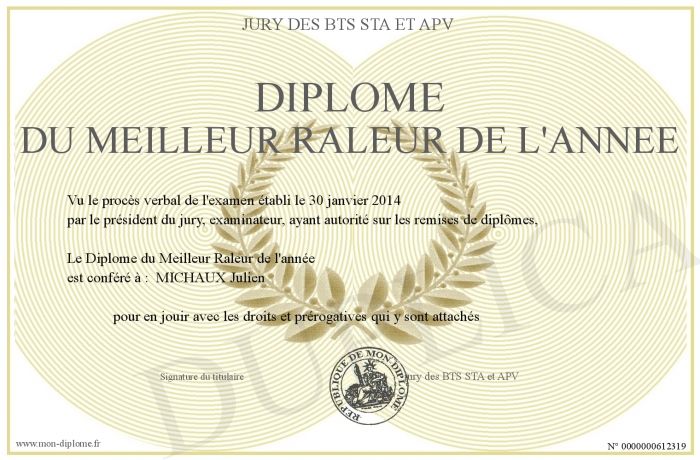 Envoyez par email votre Diplôme du Meilleur Raleur de l'année personalisé
