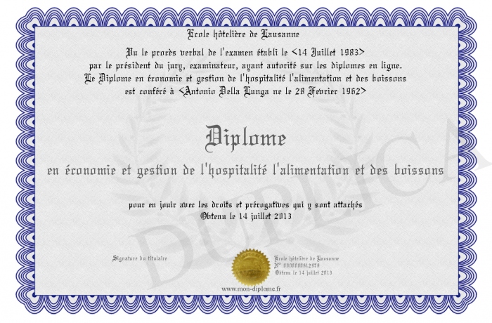 Envoyez par email votre Diplome en économie et gestion de l'hospitalité l'alimentation et des boissons personalisé