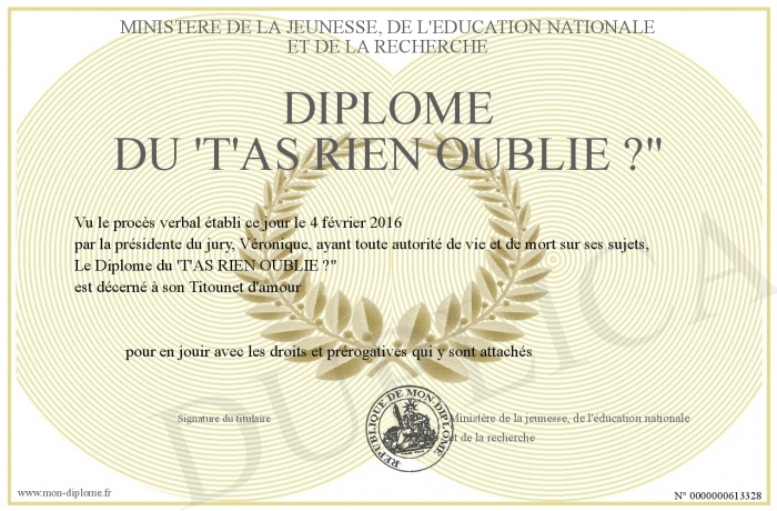 Envoyez par email votre Diplôme du 'T'AS RIEN OUBLIE ?- personalisé