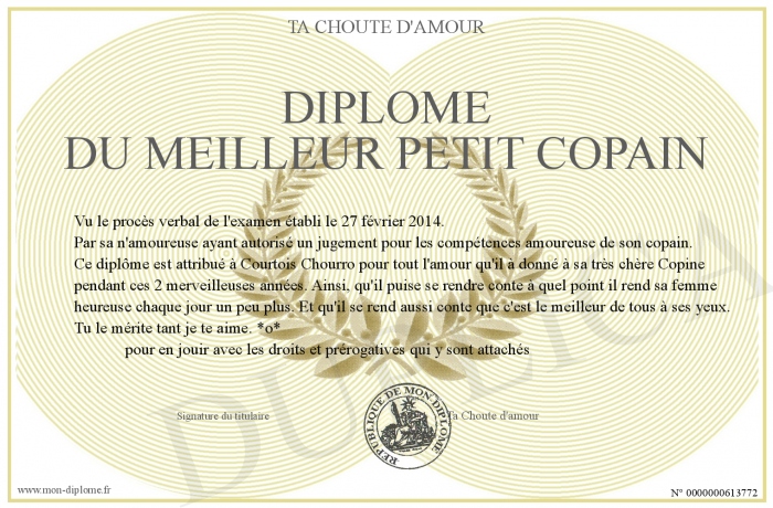 Envoyez par email votre Diplôme du meilleur petit copain personalisé