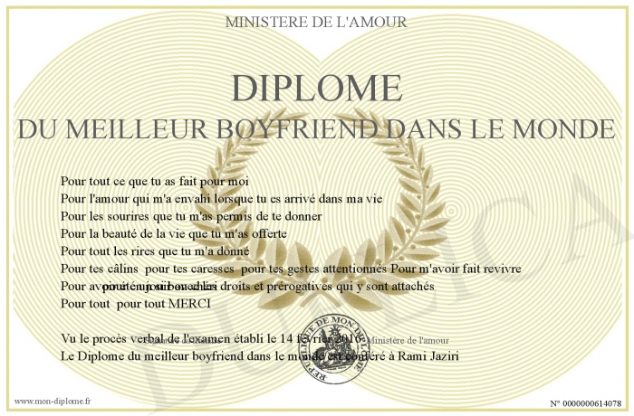 Envoyez par email votre Diplôme du meilleur boyfriend dans le monde personalisé