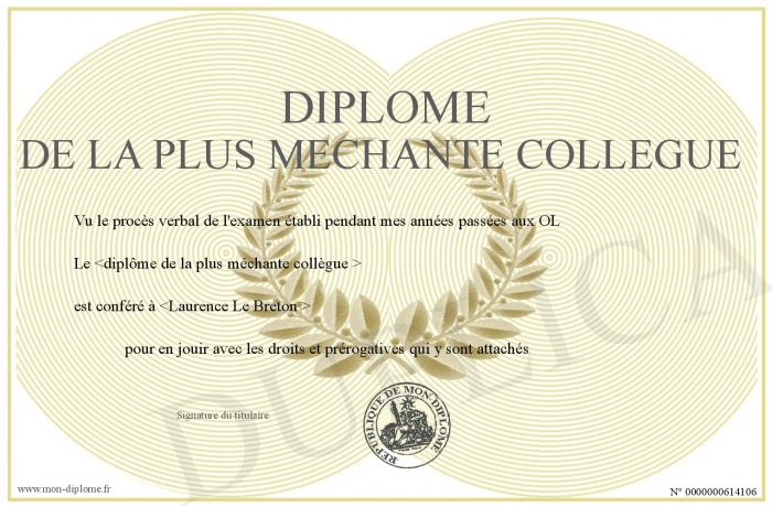 Envoyez par email votre Diplôme de la plus méchante collègue personalisé