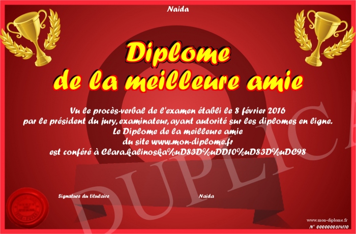Envoyez par email votre Diplôme de la meilleure amie personalisé