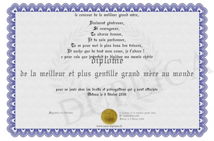 Envoyez par email votre diplôme de la meilleur et plus gentille grand mère au monde personalisé