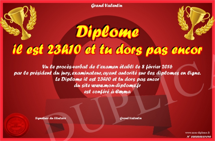 Envoyez par email votre Diplôme il est 23h10 et tu dors pas encor personalisé