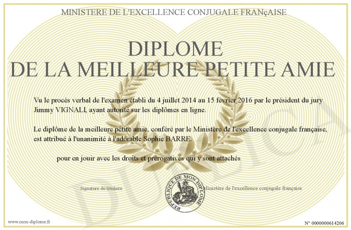 Envoyez par email votre Diplôme de la meilleure petite amie personalisé