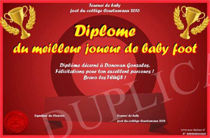 Envoyez par email votre Diplôme du meilleur joueur de baby foot personalisé
