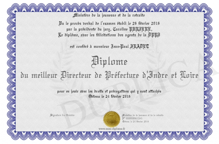 Envoyez par email votre Diplôme du meilleur Directeur de Préfecture d'Indre et Loire personalisé