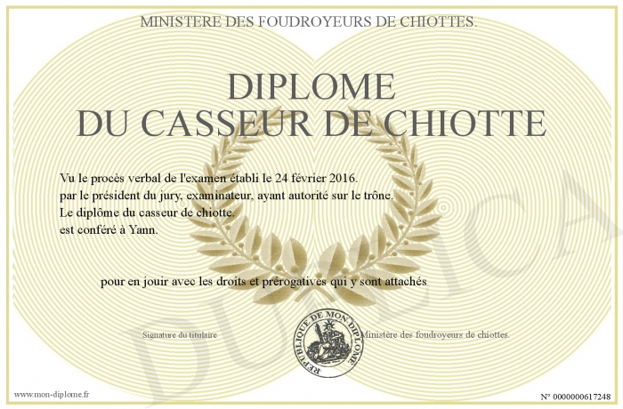 Envoyez par email votre Diplôme du casseur de Chiotte personalisé