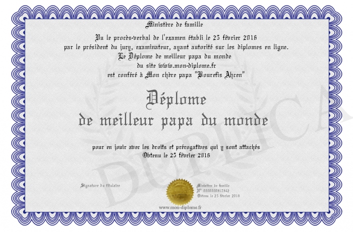 Envoyez par email votre Déplome de meilleur papa du monde personalisé