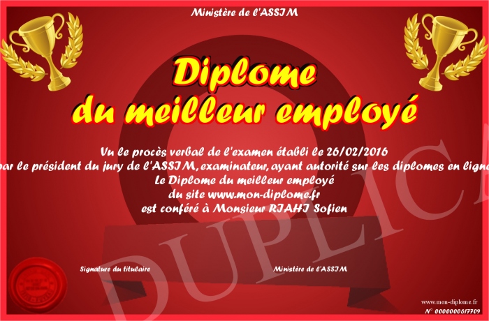 Envoyez par email votre Diplome du meilleur employé personalisé