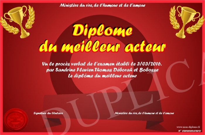 Envoyez par email votre Diplome du meilleur acteur personalisé