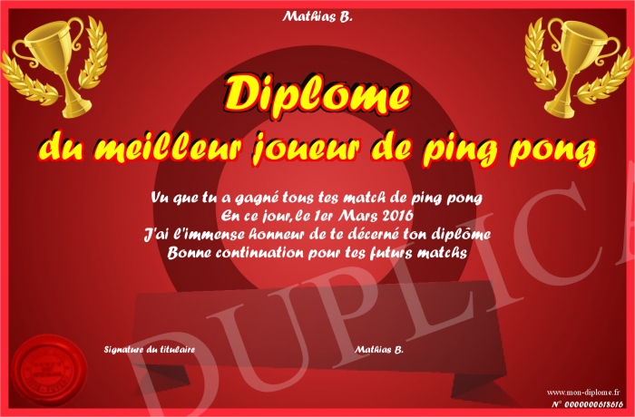 Envoyez par email votre Diplôme du meilleur joueur de ping pong personalisé