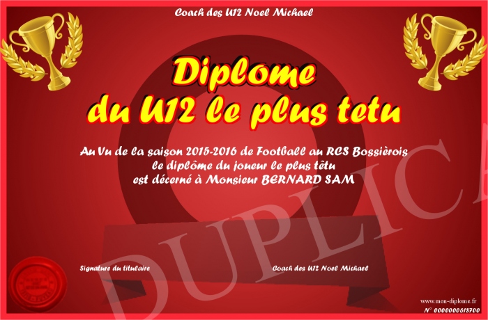 Envoyez par email votre Diplôme du U12 le plus tetu personalisé