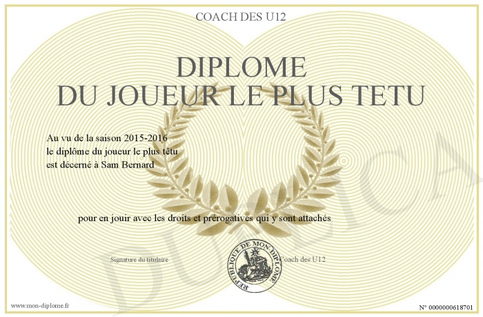 Envoyez par email votre Diplôme du joueur le plus tetu personalisé