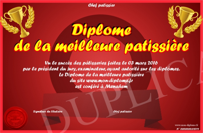 Envoyez par email votre Diplôme de la meilleure patissière personalisé