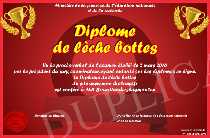 Envoyez par email votre Diplôme de lèche bottes personalisé