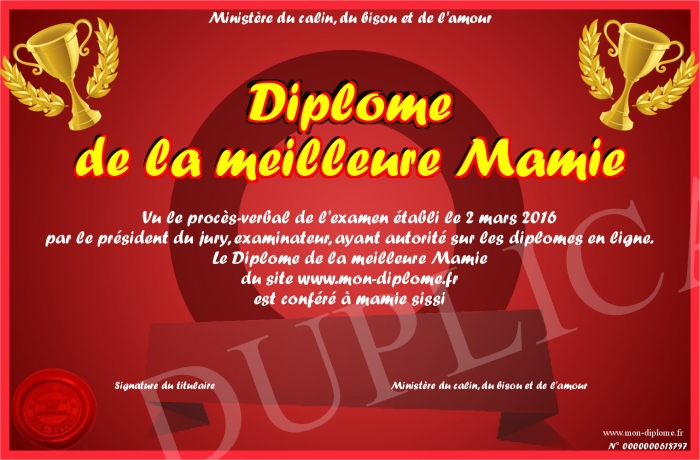 Envoyez par email votre Diplome de la meilleure Mamie personalisé