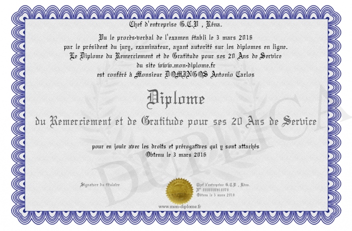 Envoyez par email votre Diplôme du Remerciement et de Gratitude pour ses 20 Ans de Service personalisé