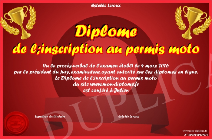 Envoyez par email votre Diplôme de l;inscription au permis moto personalisé