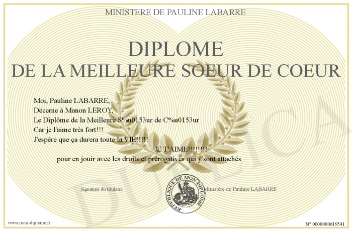 Envoyez par email votre Diplôme de la Meilleure Soeur de Coeur personalisé
