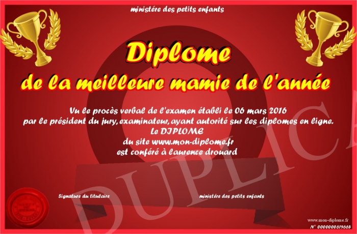 Envoyez par email votre Diplôme de la meilleure mamie de l'année personalisé