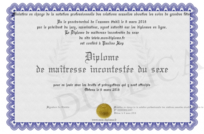 Envoyez par email votre Diplôme de maîtresse incontestée du sexe personalisé