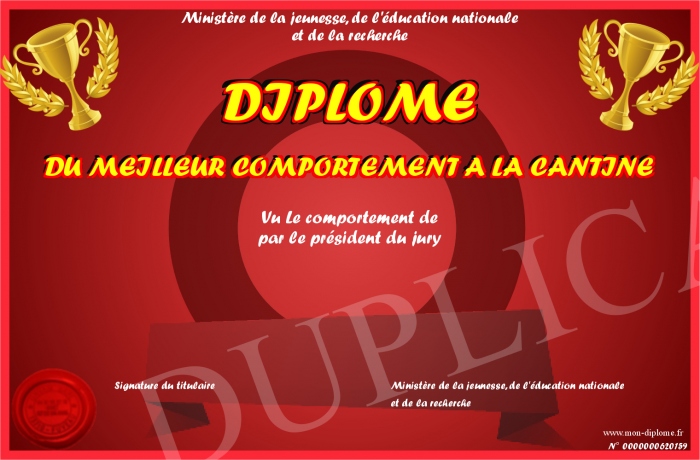 Envoyez par email votre DIPLOME DU MEILLEUR COMPORTEMENT A LA CANTINE personalisé