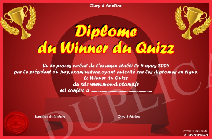 Envoyez par email votre Diplôme du Winner du Quizz personalisé