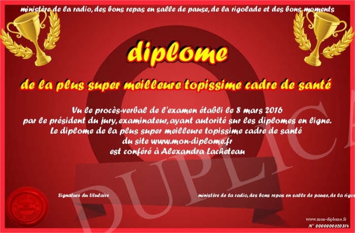 Envoyez par email votre diplôme de la plus super meilleure topissime cadre de santé personalisé