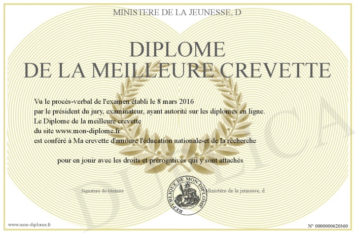 Envoyez par email votre Diplôme de la meilleure crevette personalisé