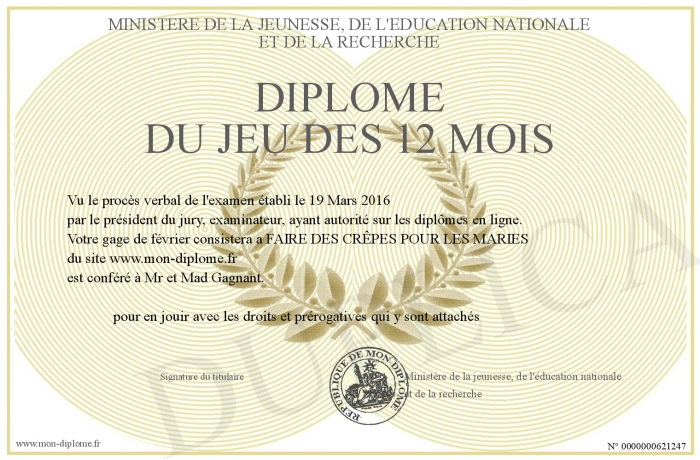 Envoyez par email votre Diplôme du jeu des 12 mois personalisé
