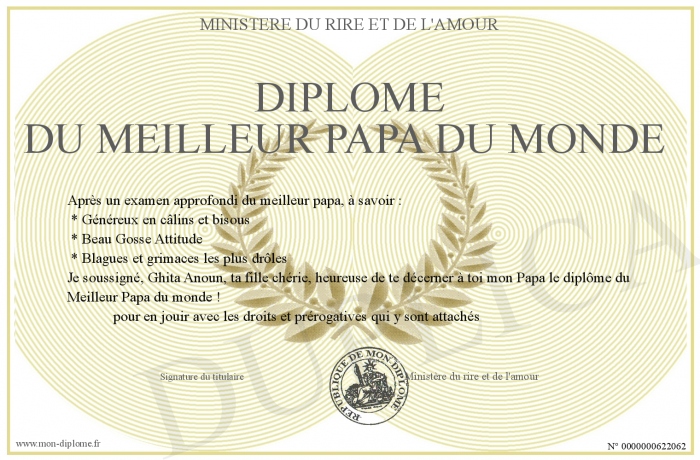 Envoyez par email votre Diplôme du Meilleur Papa du Monde personalisé