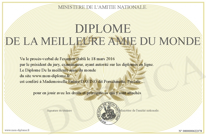 Envoyez par email votre Diplôme De la meilleure amie du monde personalisé