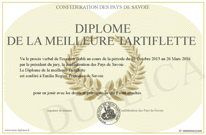 Envoyez par email votre Diplôme de la meilleure Tartiflette personalisé