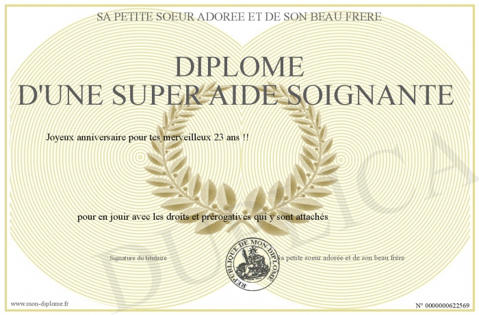 Envoyez par email votre Diplôme d'une SUPER AIDE SOIGNANTE personalisé