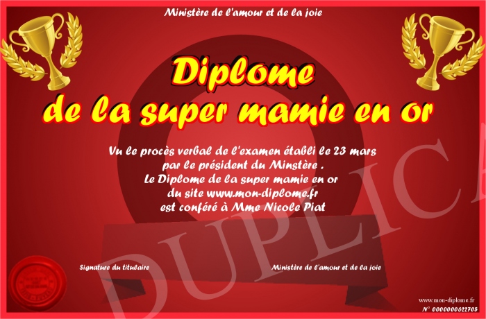 Envoyez par email votre Diplôme de la super mamie en or personalisé