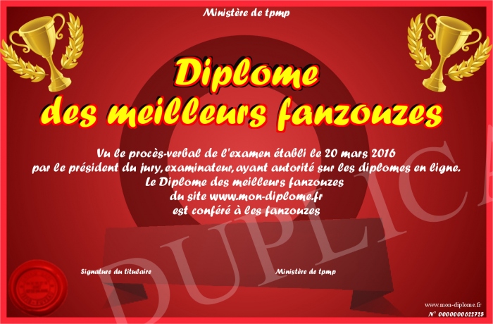 Envoyez par email votre Diplôme des meilleurs fanzouzes personalisé