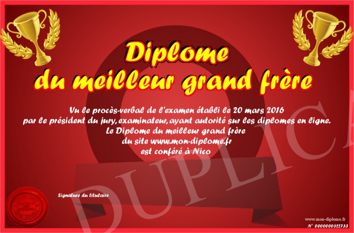 Envoyez par email votre Diplôme du meilleur grand frère personalisé