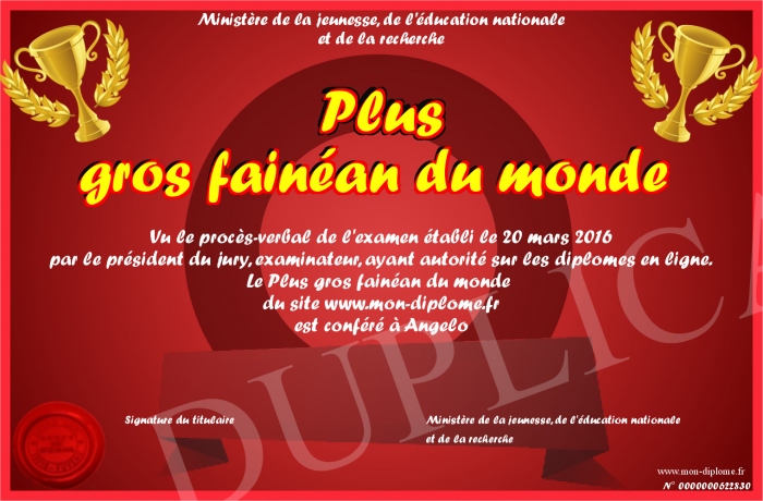 Envoyez par email votre Plus gros fainéan du monde personalisé