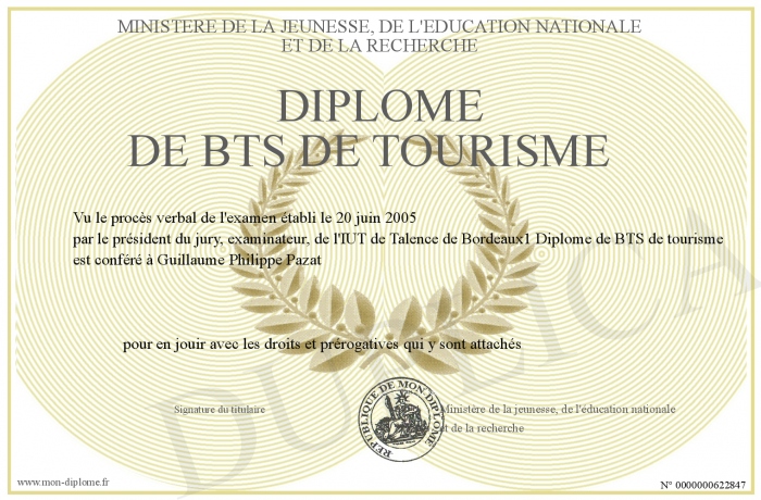 Envoyez par email votre Diplome de BTS de tourisme personalisé